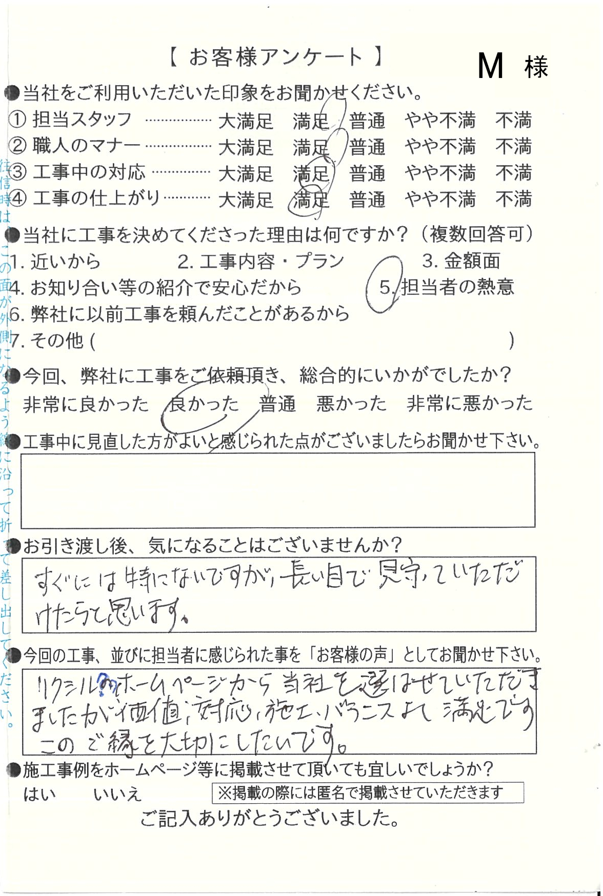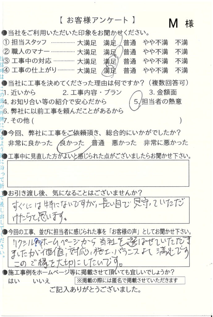 リクシルのホームページから当社を選ばせていただきましたが
