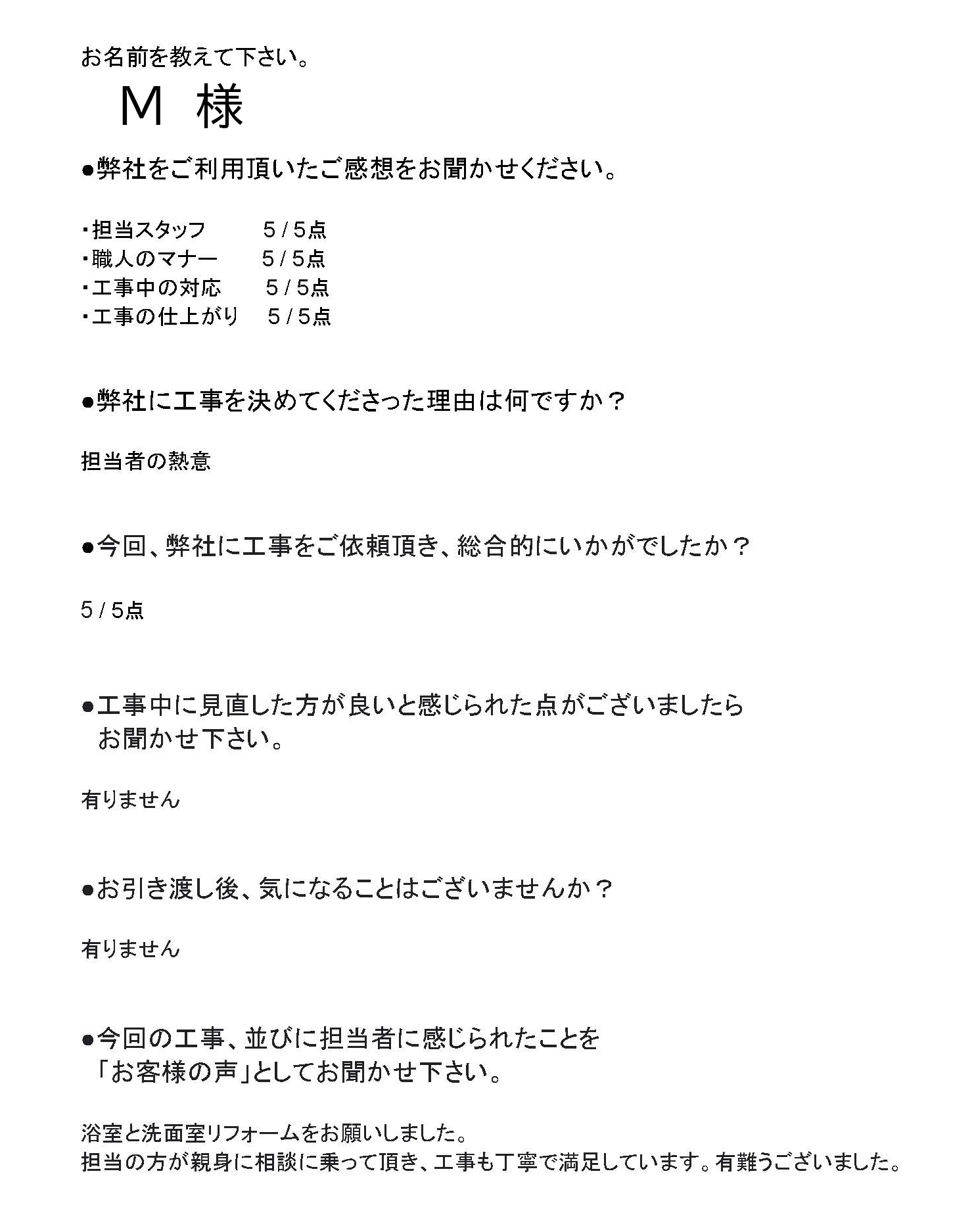 M様より 2026年4月15日 【お客様の声】 浴室と洗面室リフォームをお願いしました。 担当の方が親身に相談に乗っていただき、工事も丁寧で満足しています。 有難うございました。 ※Webよりアンケートにご協力くださいまして、ありがとうございます N様より Y様より