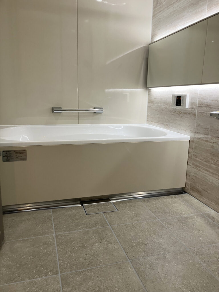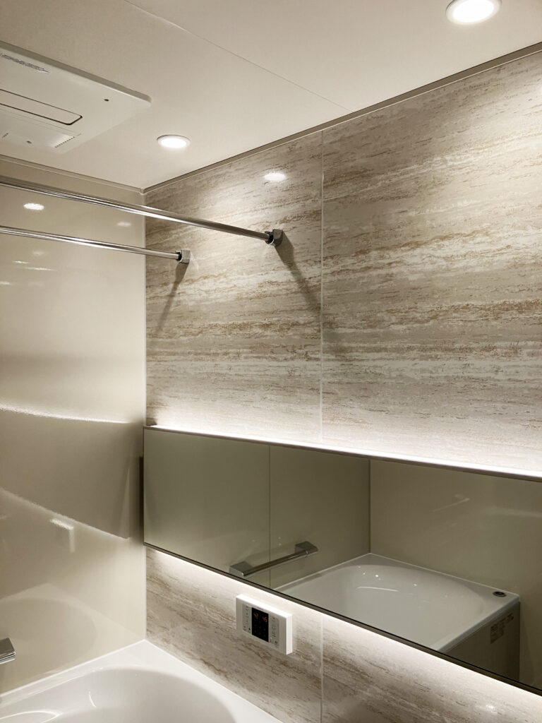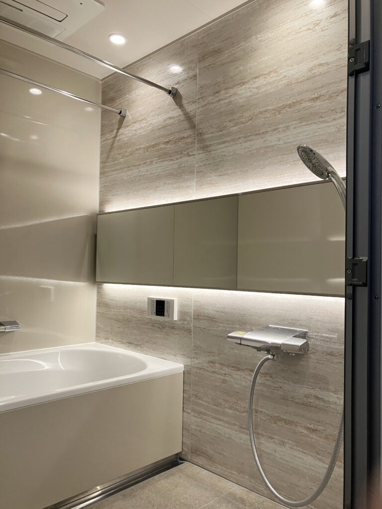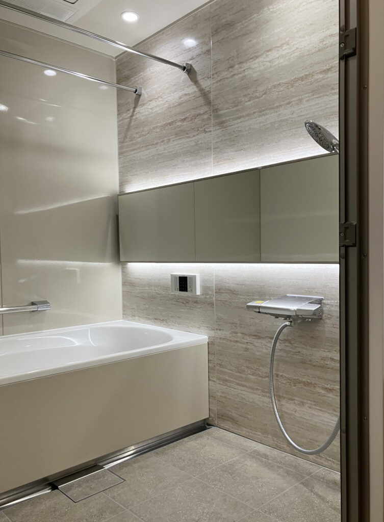壁面や浴槽まわりは清掃性にも配慮し、見た目の美しさと日々の手入れのしやすさを両立。