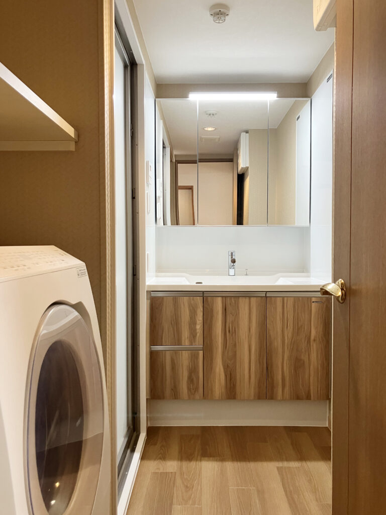 洗面台リフォームでは、間口に合わせたサイズへと見直し、動線と収納力を改善。